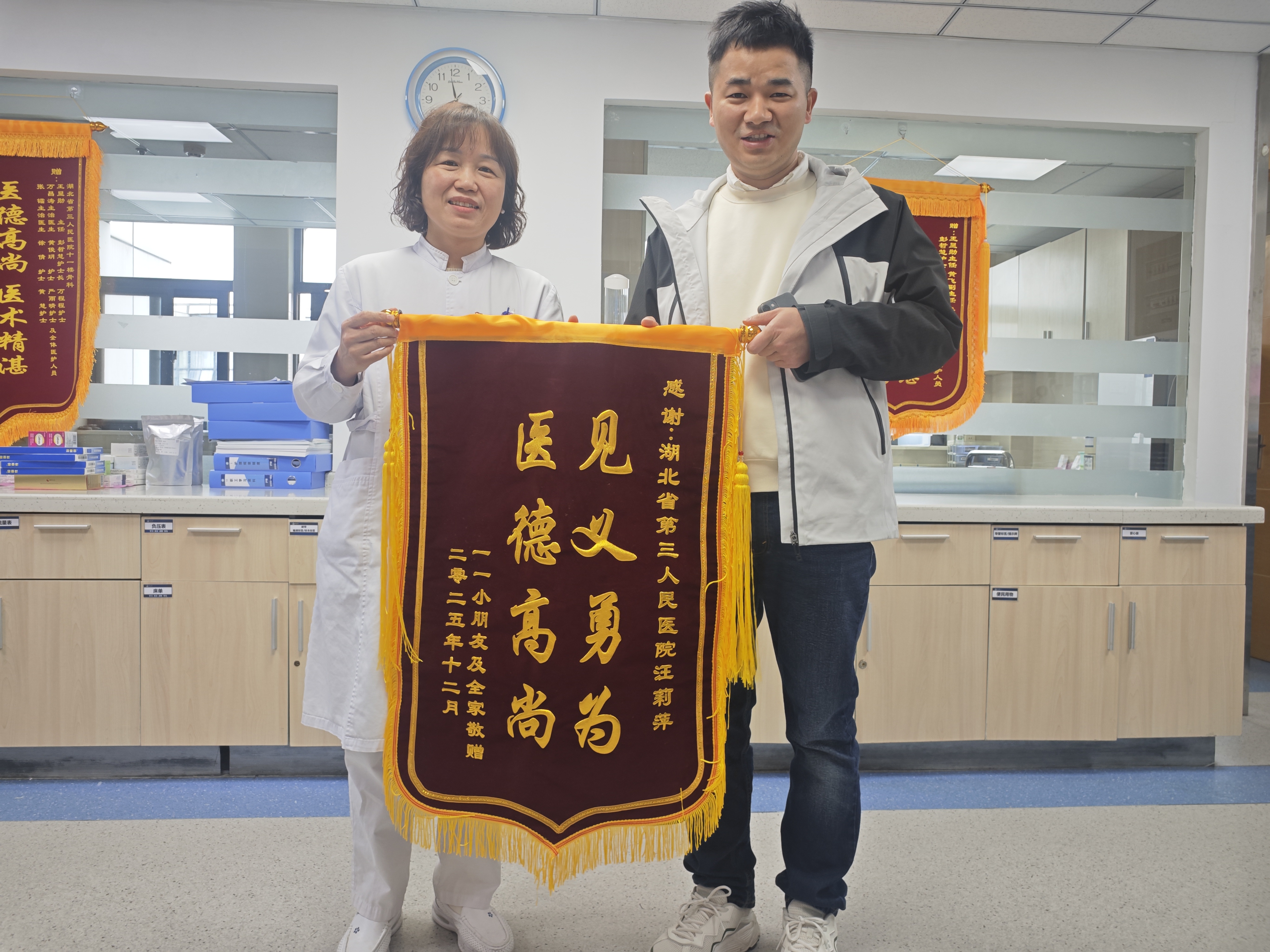 12月22日上午,湖北省第三人民医院(湖北省中山医院)骨外科护士站前上演暖心一幕:患儿家属将一面写有“见义勇为,医德高尚”的锦旗,郑重送到护士汪莉萍手中。“那天晚上要不是遇到汪护士,真不知道孩子会怎么样。多亏了汪莉萍护士的及时出手,将我们的孩子从危险边缘拉了回来!”患儿父亲连连致谢。